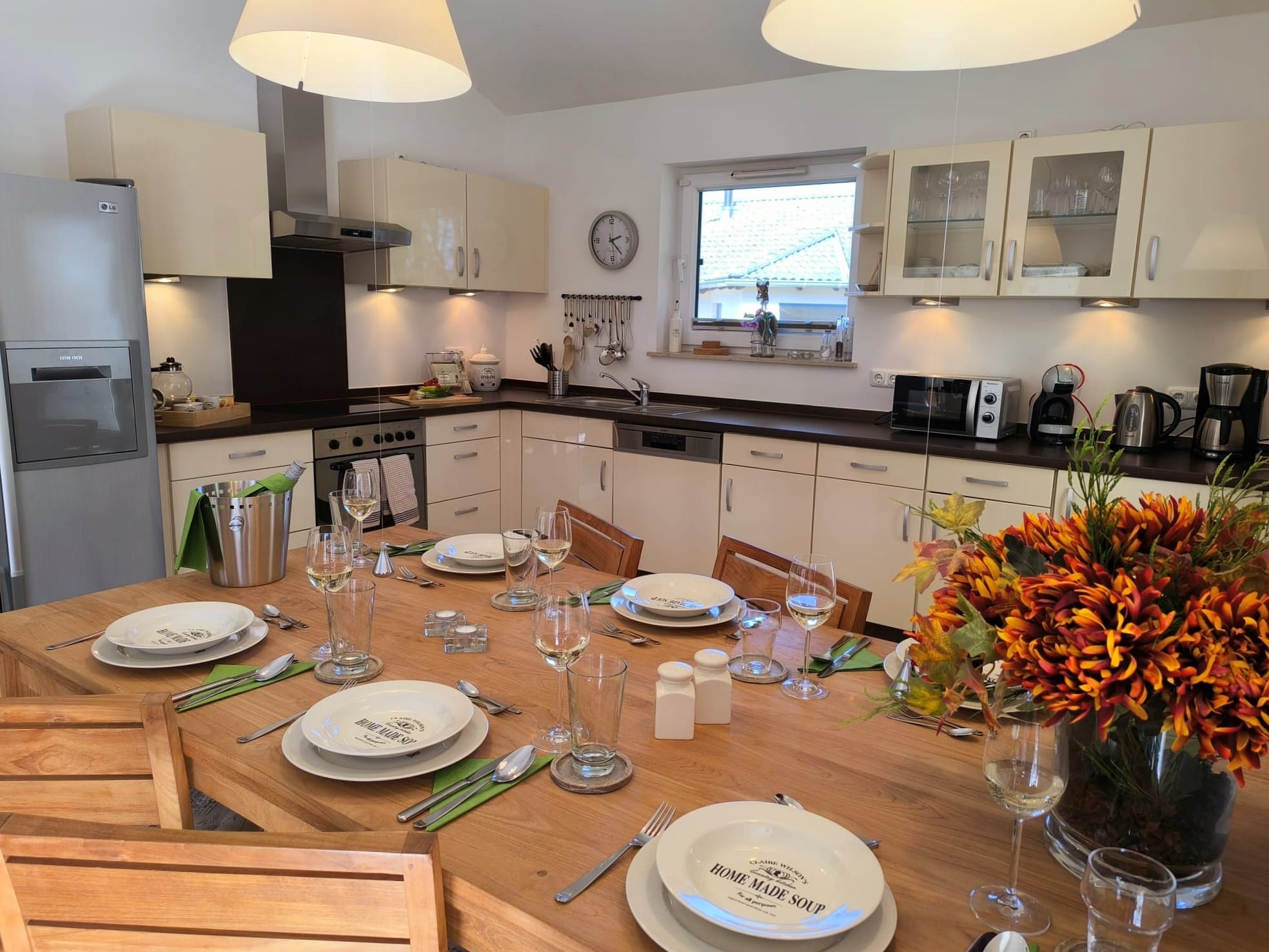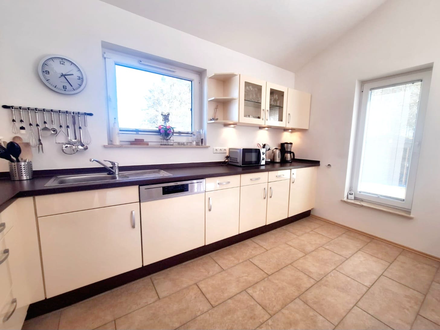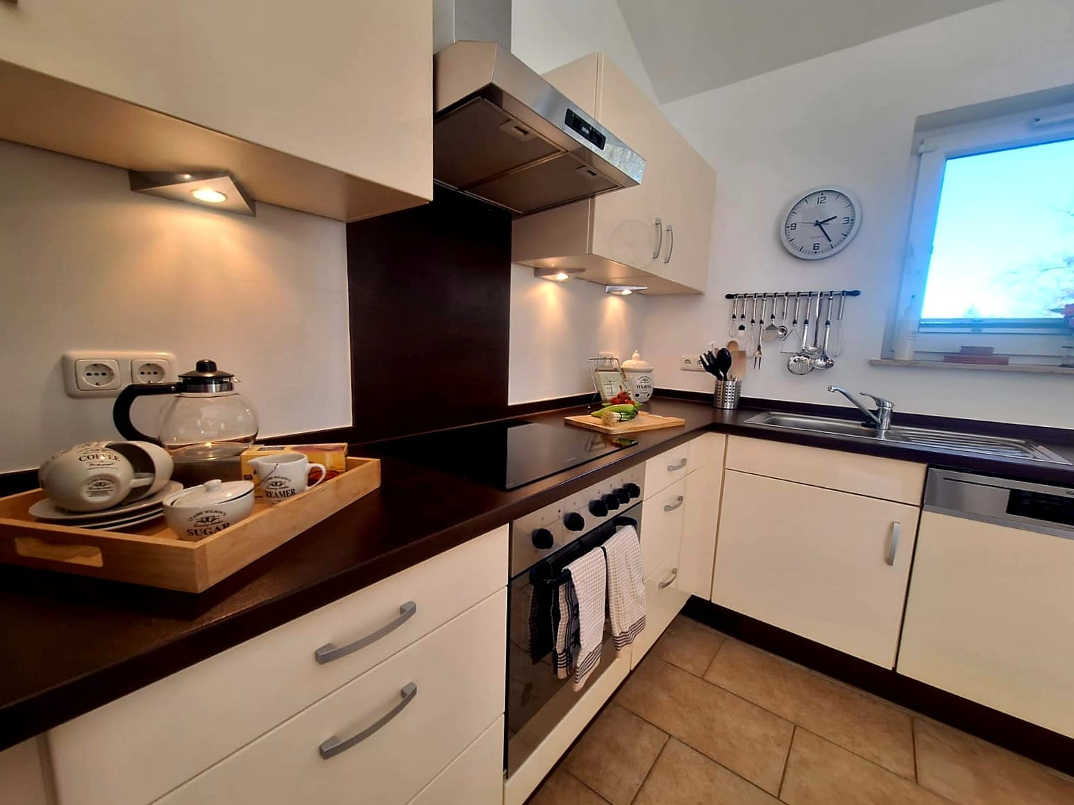 Die voll ausgestattete Küche mit Geschirrspüler, Backofen und Kaffeemaschine bietet besten Komfort für Selbstversorger.