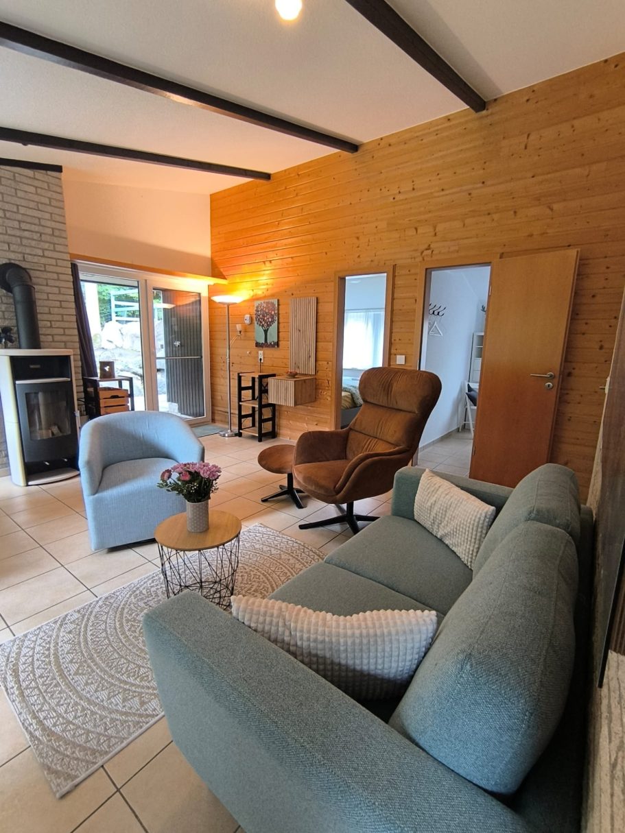 Der offene Wohnbereich ist mit bequemer Sitzgarnitur, Smart-TV, Kaminofen, Klimaanlage und kostenfreiem WLAN ausgestattet und sorgt für entspannte Stunden zu jeder Jahreszeit.