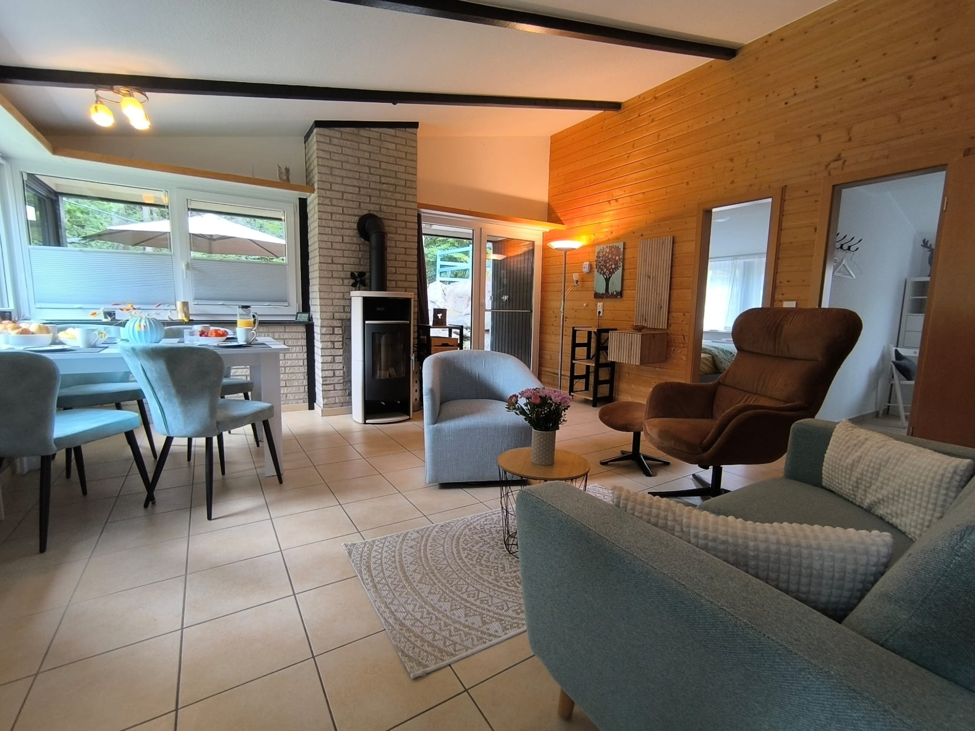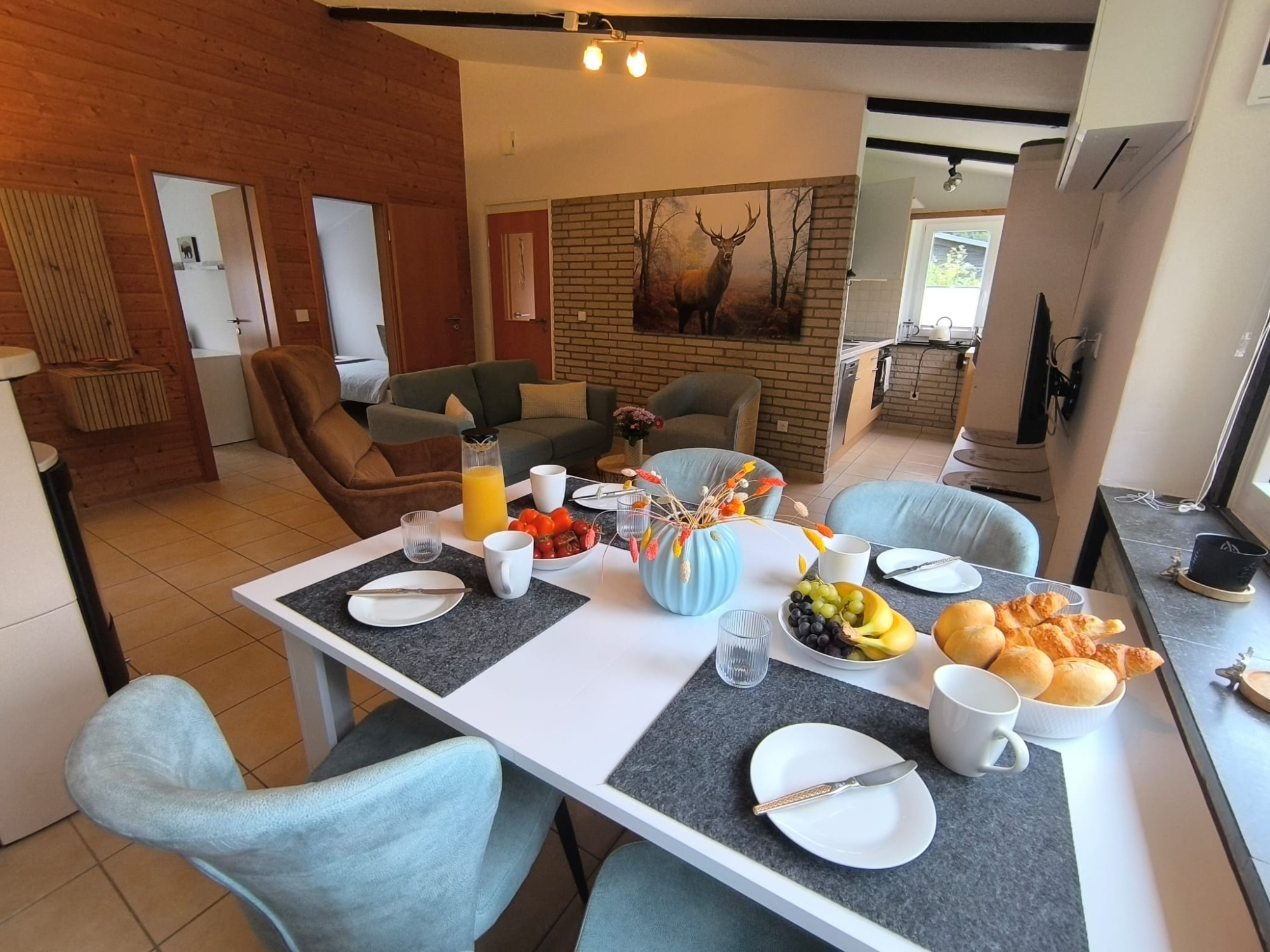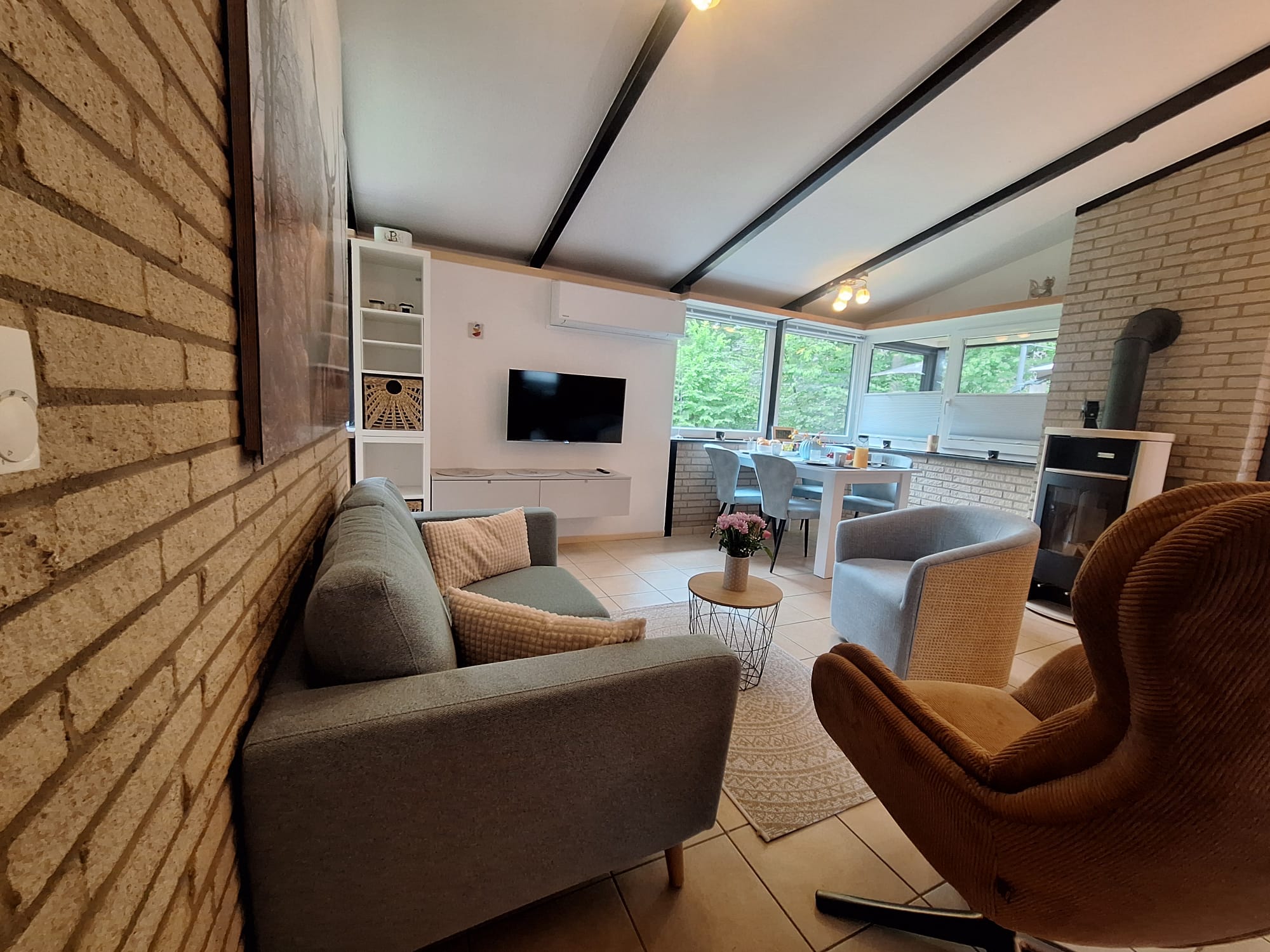 Der offene Wohnbereich ist mit bequemer Sitzgarnitur, Smart-TV, Kaminofen, Klimaanlage und kostenfreiem WLAN ausgestattet und sorgt für entspannte Stunden zu jeder Jahreszeit.