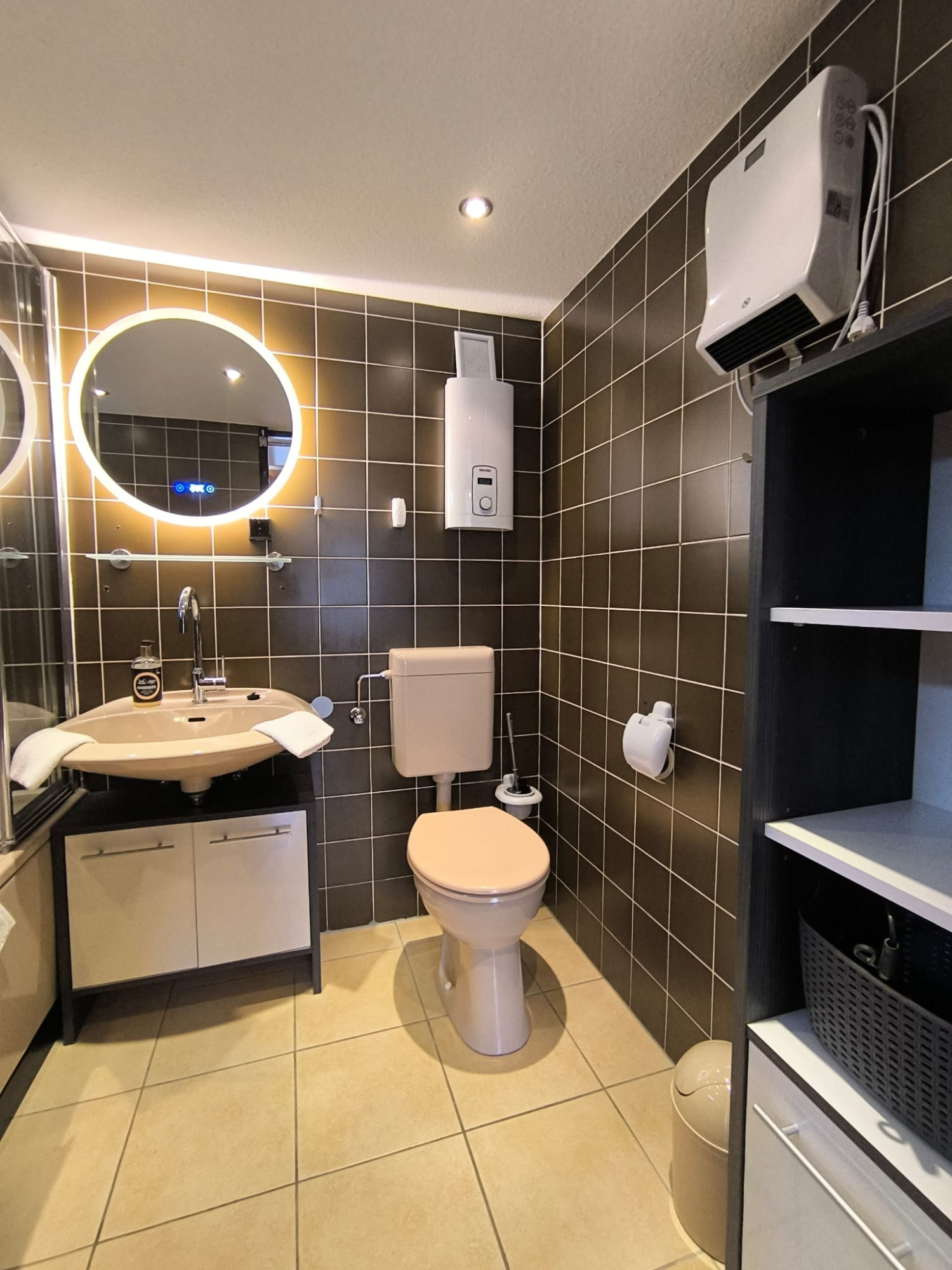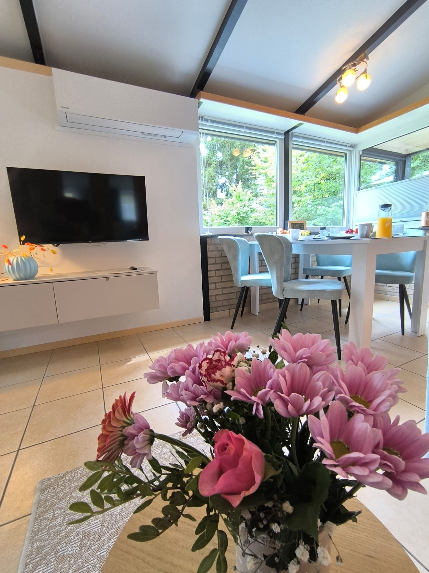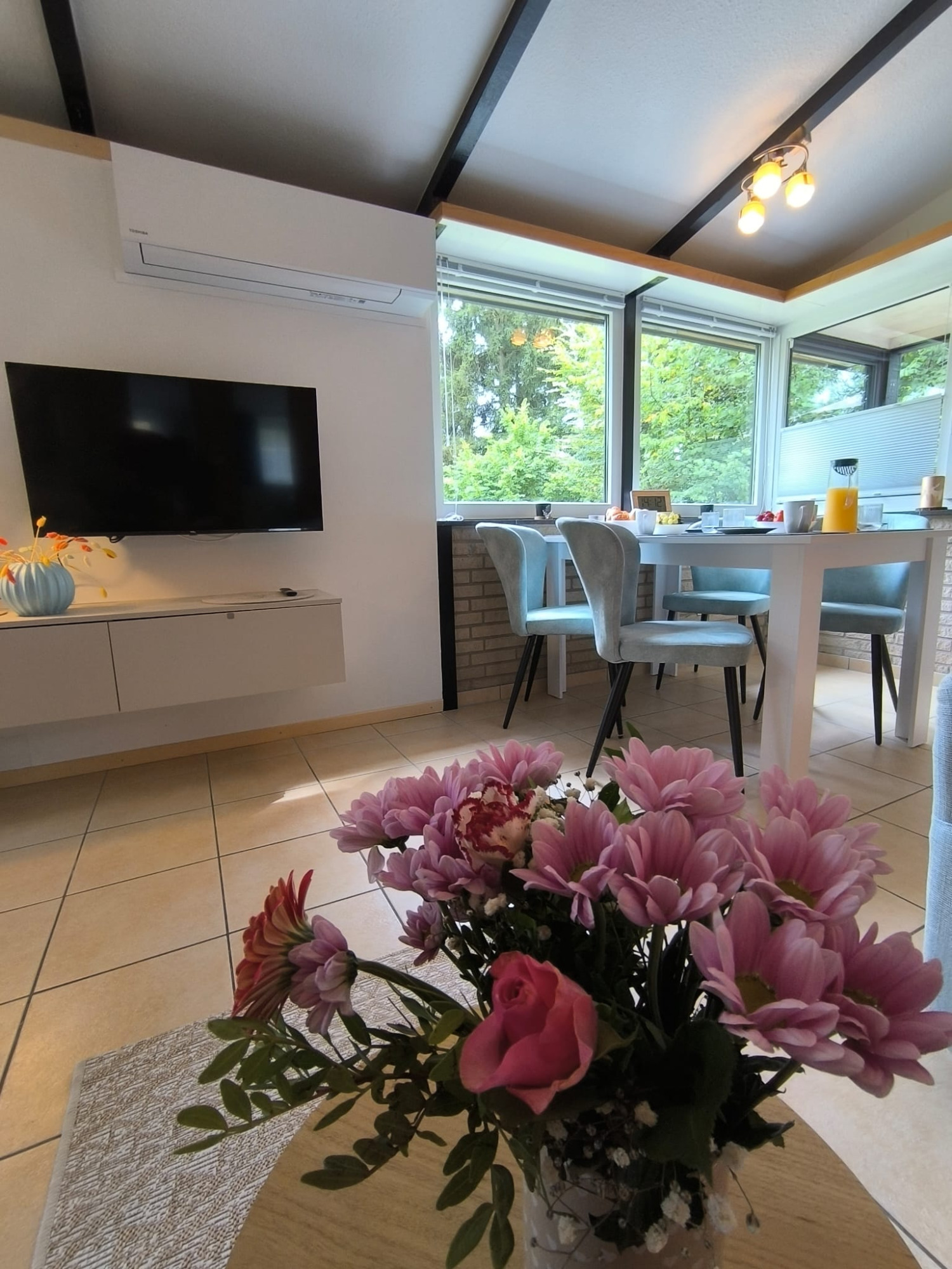 Der offene Wohnbereich ist mit bequemer Sitzgarnitur, Smart-TV, Kaminofen, Klimaanlage und kostenfreiem WLAN ausgestattet und sorgt für entspannte Stunden zu jeder Jahreszeit.