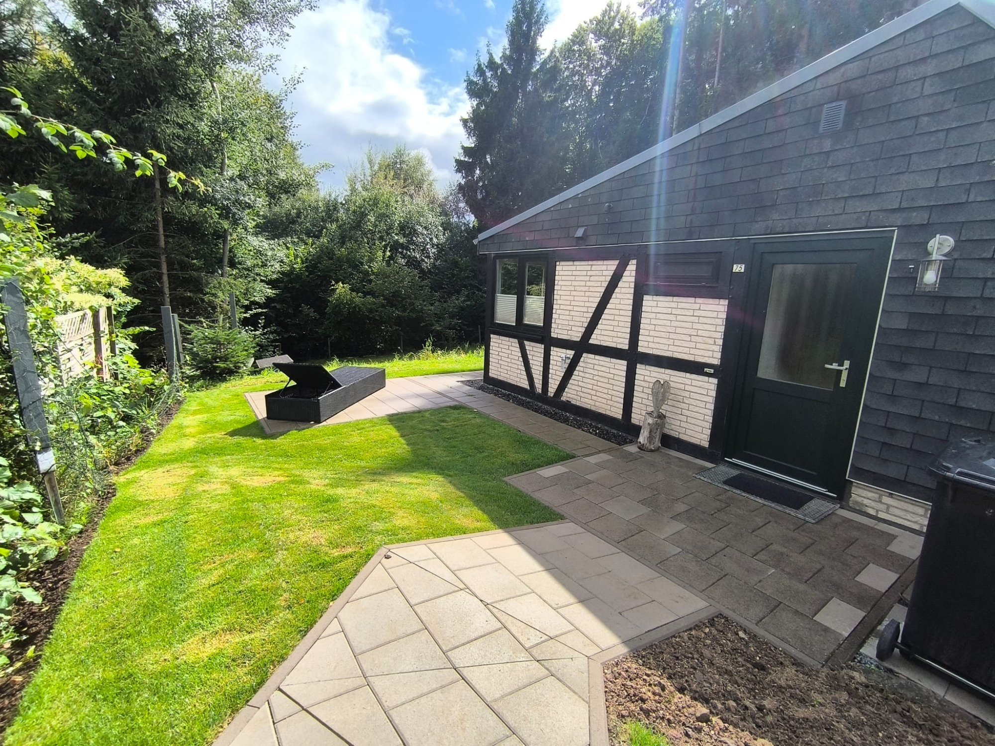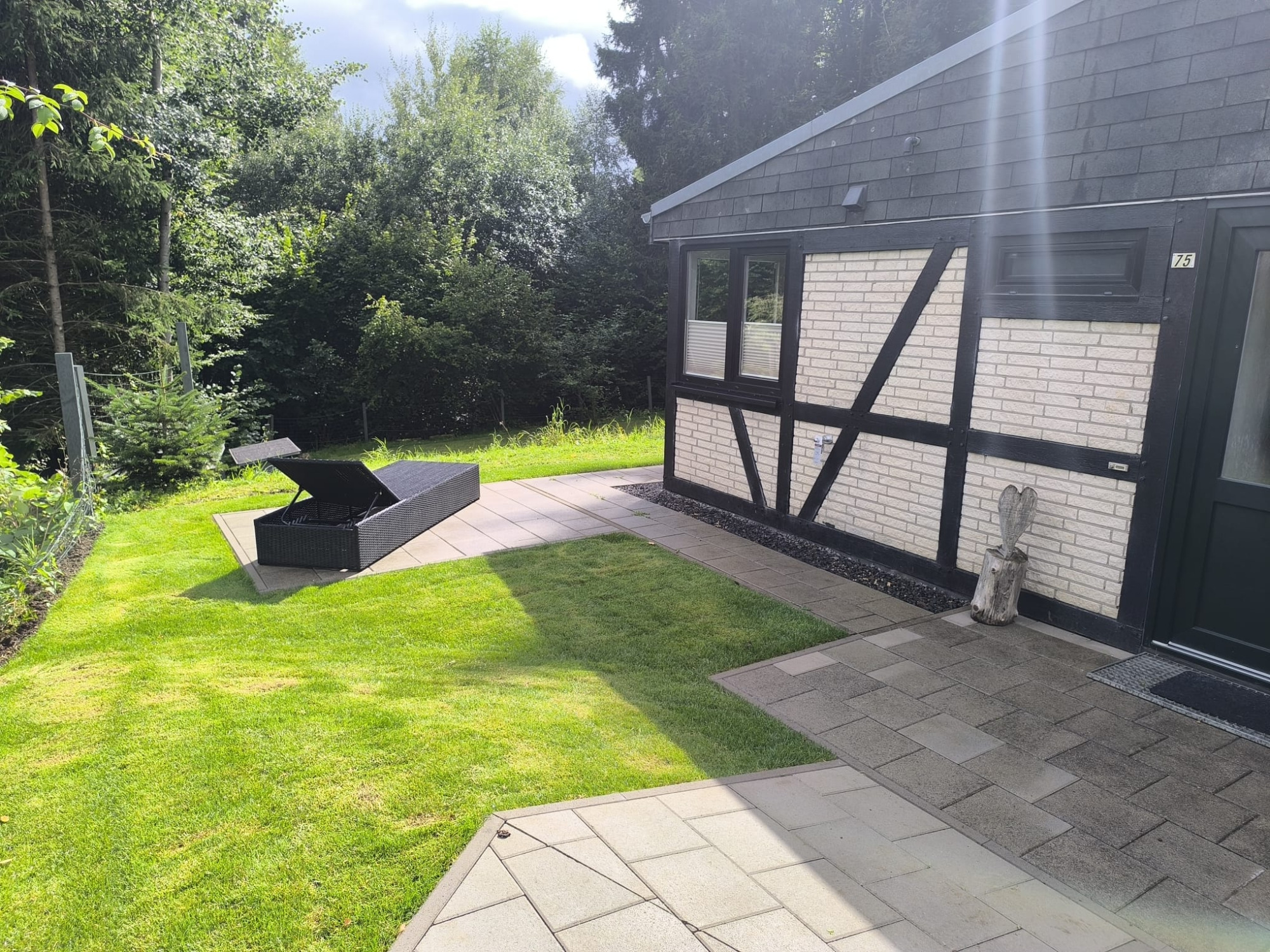 Im Außenbereich laden Terrasse mit Lounge und Gartenmöbeln sowie die angrenzende Wiese zum Verweilen ein. Haustiere sind willkommen, und kostenlose Parkplätze stehen direkt am Haus zur Verfügung.