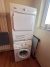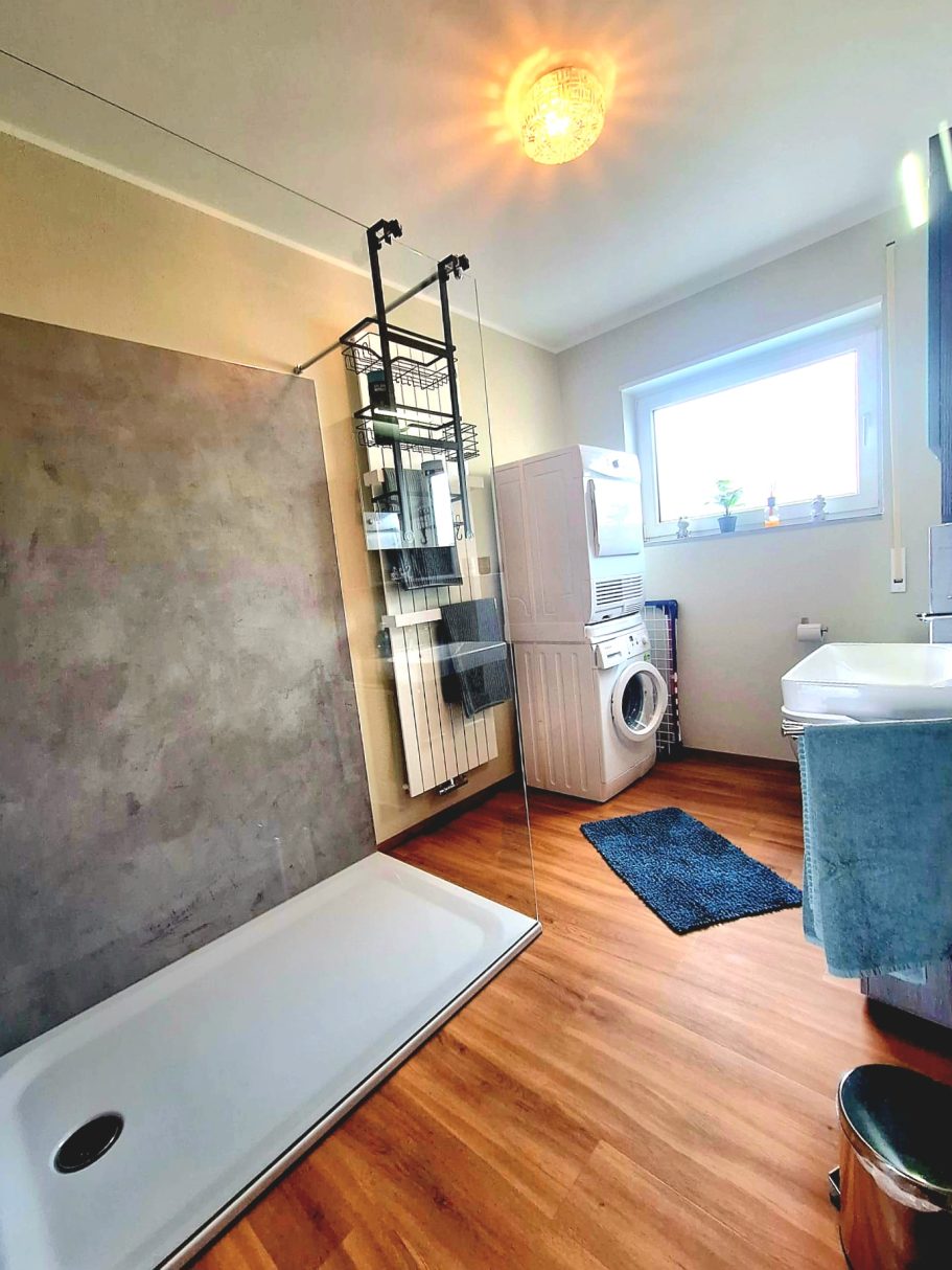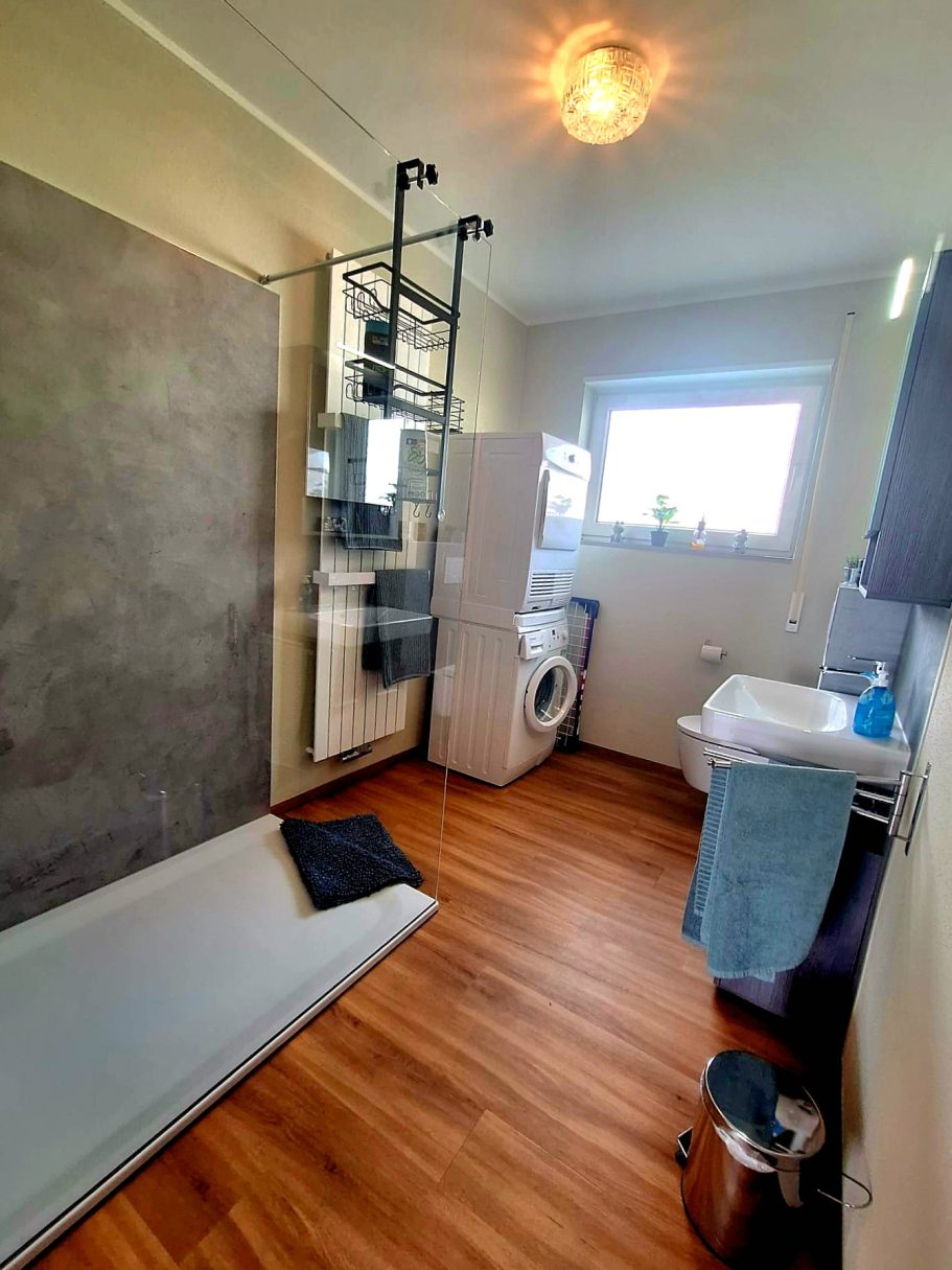 Ein modernes Badezimmer mit Waschmaschine, Trockner, WC, Waschtisch und großer Dusche sorgt für Komfort während des Aufenthalts.