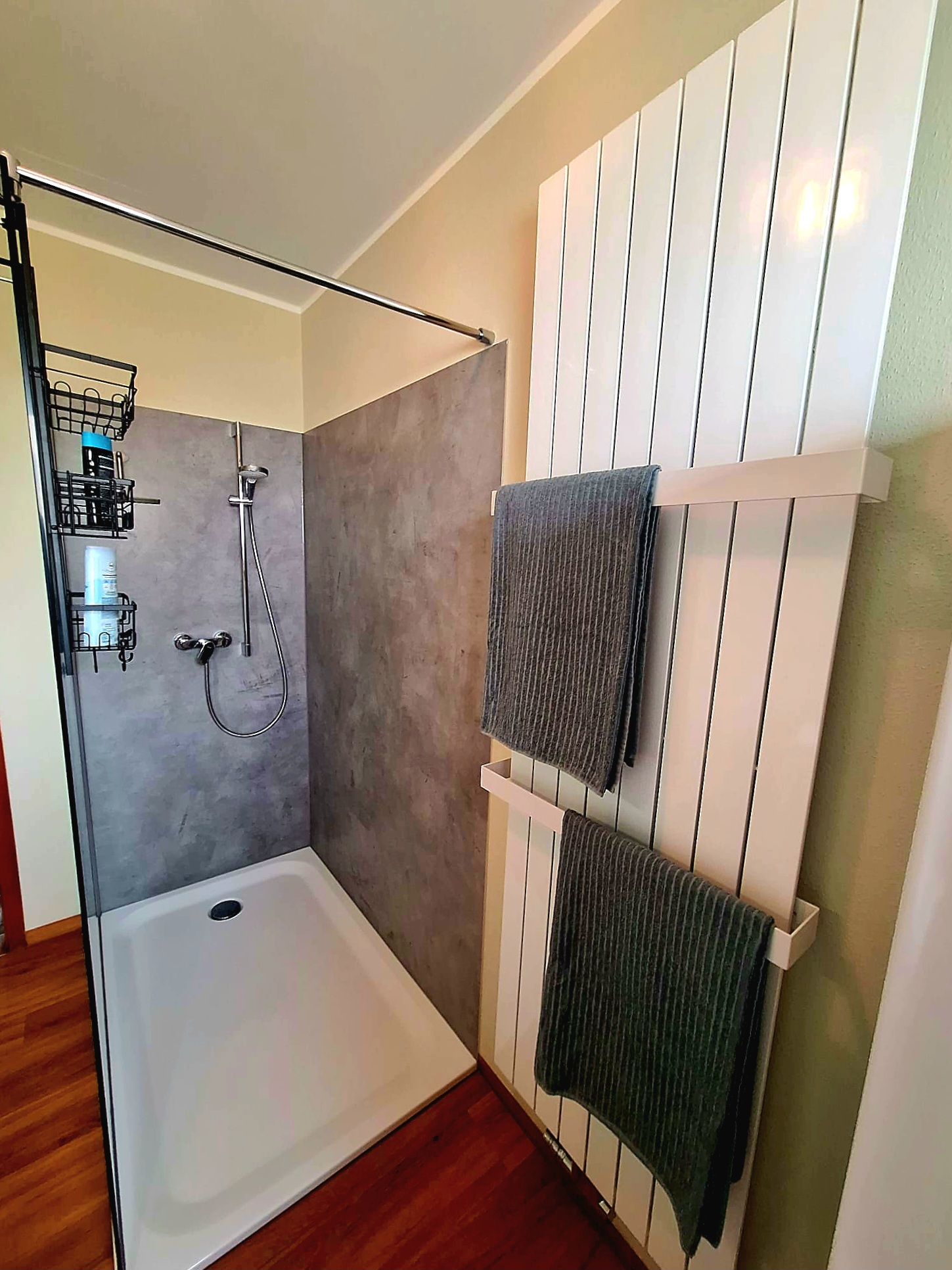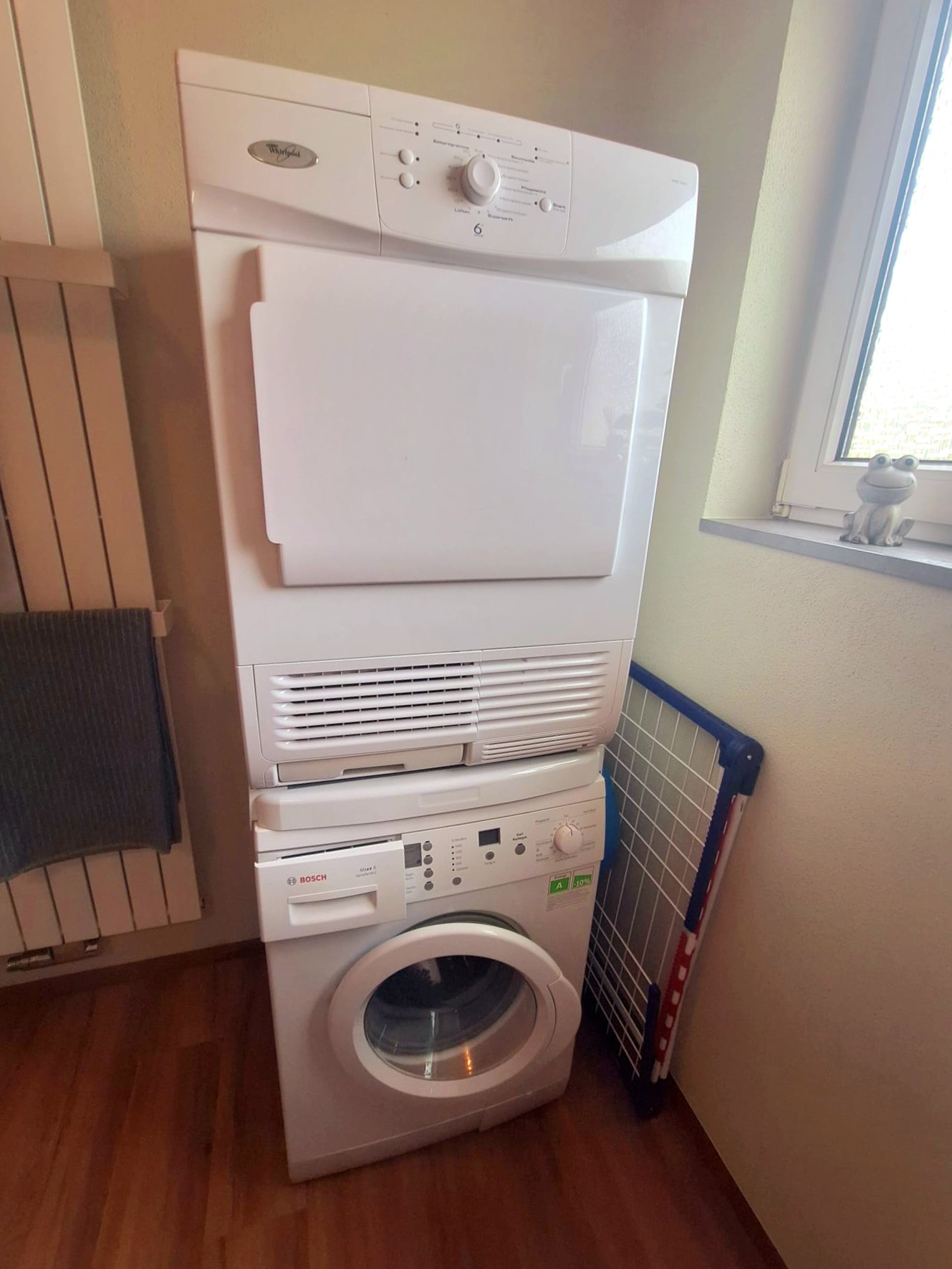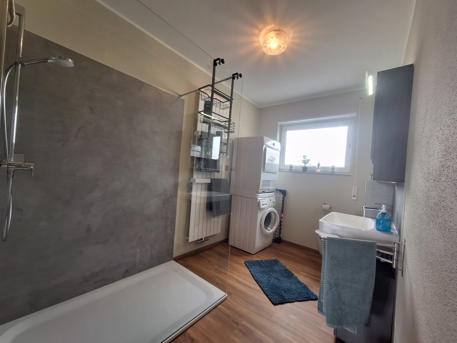 Ein modernes Badezimmer mit Waschmaschine, Trockner, WC, Waschtisch und großer Dusche sorgt für Komfort während des Aufenthalts.
